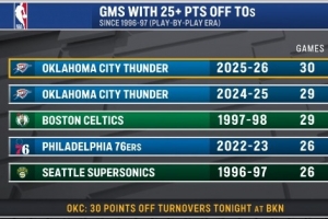 96-97賽季以來單賽季利用對手失誤得到25+紀錄:
