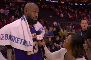 賽后,詹姆斯在場邊接受了記者(Lisa Salters)采訪。他說道:“我本來要立刻回更衣室冰敷(手肘),但我愛你,你太棒了, 我必須回來接受你的采訪。”