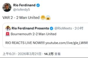 體育資訊03月21日訊 英超第31輪,10人曼聯客場2-2戰平伯恩茅斯,本場比賽的判罰引發爭議。賽后,費迪南德憤怒發文:“VAR 2-2 曼聯????”。