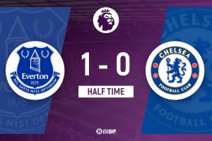 上半場傷停補時2分鐘,半場結束,切爾西暫0-1埃弗頓。