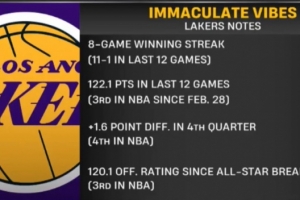 據統計,球隊目前保持8連勝(近12場11勝1負),近12戰場均轟下122.1分(自2月28日以來聯盟第3),第四節凈勝分達+1.6(聯盟第4),全明星賽后進攻效率高達120.1(聯盟第3)。