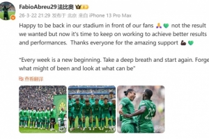 體育資訊3月22日訊 國安外援法比奧更新社媒,談到了本輪主場(chǎng)1-1戰(zhàn)平申花的感受。