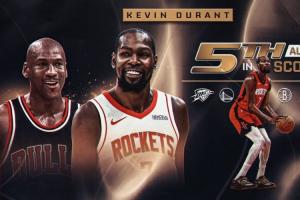 體育資訊3月23日訊 NBA常規(guī)賽,火箭123-122力克熱火。杜蘭特生涯總得分超越喬丹,上升至NBA歷史第五。