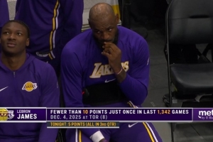 (過去1342場比賽,詹姆斯僅1場沒有得分上雙)