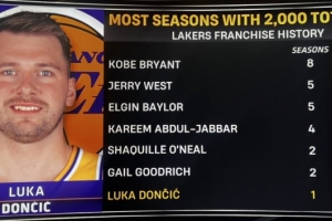 東契奇29投11中,三分球13中3,8罰7中得到32分7板6助3斷。算上這32分,他賽季總得分2005分,是湖人隊史第七位單賽季得分突破2000的球員。
