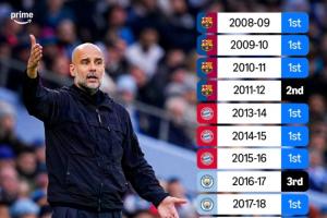 據轉播商亞馬遜統(tǒng)計,瓜迪奧拉執(zhí)教生涯至今從未連續(xù)兩個賽季無緣聯(lián)賽冠軍。