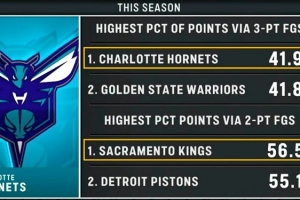 三分命中數占比:黃蜂41.9%第一,勇士41.8%第二