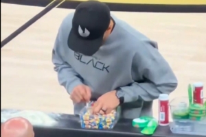 體育資訊3月27日訊 昨日勇士109-106戰勝籃網,有網友的鏡頭捕捉到庫里在場邊偷偷藏糖果一幕。
