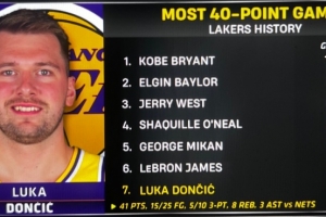 據統計,這是東契奇湖人生涯第17次單場40+,湖人隊史第七多,差一場追平詹姆斯,詳情如下: