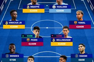中場:維尼修斯(1.5億歐,皇馬),佩德里(1.5億歐,巴薩),貝林厄姆(1.4億歐,皇馬),亞馬爾(2億歐,巴薩)