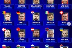 體育資訊3月29日訊 德國轉會市場盤點了歐足聯(lián)旗下各隊歷史身價最高球員,亞馬爾、哈蘭德和姆巴佩2億歐并列榜首,C羅最高1.2億歐。