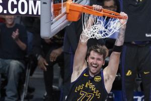 比賽最后時刻,東契奇快攻完成扣籃;Skip評論道:“等等,盧卡也能扣籃?在比賽最后時刻的快攻中,他雙腳起跳,依然留在場內完成了一記扣籃。在主場大勝的最后時刻,他還在場上呢。”