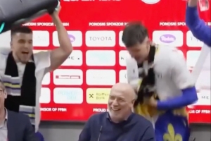 波黑主帥巴巴雷茨出席賽后發布會,波黑球員帶著音響闖入發布會現場,慶祝球隊晉級世界杯。