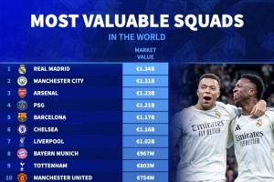 全球身價前20球隊:皇馬13.4億居首,曼城槍手分列二三,英超12隊
