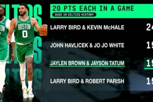 這是雙探花第194場同砍20+,隊史第三,距離第二的哈弗里切克和喬喬·懷特組合只差2場,隊史第一的是伯德和麥克海爾的249場。