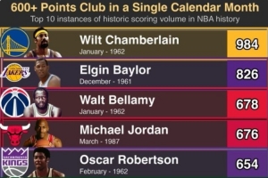 (注:上圖僅統(tǒng)計單人的最高紀(jì)錄、如張伯倫個人984為最高,但還有多次900+、800+、700+、600+)