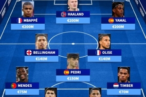 前鋒:姆巴佩(法國、皇馬、2億歐)、哈蘭德(挪威、曼城、2億歐)、亞馬爾(西班牙、巴薩、2億歐)