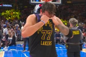 比賽第三節(jié),東契奇在一次突破中受傷倒地,隨后雙手掩面非常痛苦。