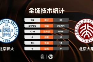 末節(jié)比賽,北京師大率先發(fā)力將分差追到個(gè)位數(shù),但這個(gè)勢頭并沒有延續(xù)太長時(shí)間,及時(shí)調(diào)整的北京大學(xué)此后打出一波小高潮穩(wěn)住局勢,他們在節(jié)末轟出一波流帶走比賽,最終北京大學(xué)大勝北京師大繼續(xù)保持不敗。
