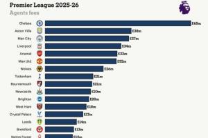 英超球隊(duì)經(jīng)紀(jì)人費(fèi)用:切爾西6500萬(wàn)鎊領(lǐng)跑,維拉、曼城利物浦前四