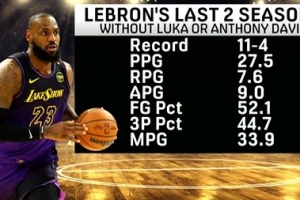 媒體oh he didn't列舉出湖人球星詹姆斯最近兩個賽季以來在東契奇或者安東尼·戴維斯缺陣時的表現: