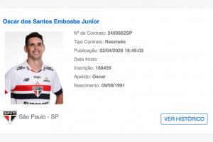 體育資訊04月04日訊 巴西足協官網的球員注冊系統中顯示,34歲奧斯卡與圣保羅已于當地時間4月2日解除合同!