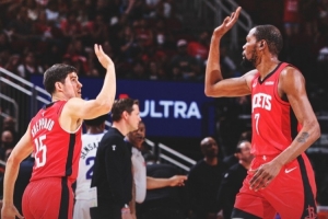 賽后火箭官方曬出本場贏球海報,杜蘭特和謝潑德登上封面。