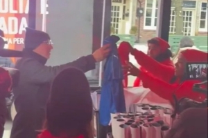 在隊伍的最前端,可以看到球迷們進(jìn)入一棟建筑領(lǐng)取加拿大的球衣,視頻中有一名球迷將一件藍(lán)色的意大利兒童球衣交給志愿者,后者遞給他一件紅色的加拿大球衣。實際上,志愿者們并沒有真的在收集意大利球衣,只是為了免費發(fā)放加拿大球衣。