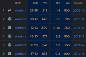 庫里缺席時勇士戰績9-16,勝率36.0%