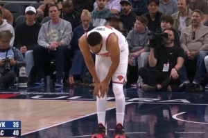 GIF-唐斯強突大洛左手上籃不中,隨后一直捂著膝蓋,有點不適