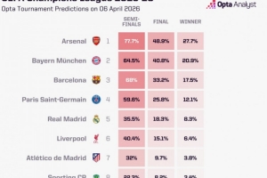 OPTA對(duì)各隊(duì)晉級(jí)概率進(jìn)行了預(yù)測(cè),阿森納晉級(jí)概率高達(dá)77.7%,拜仁為64.5%,巴薩為68%,而巴黎圣日耳曼則為59.6%。在這樣的情況下,皇馬、利物浦、馬競(jìng)和葡萄牙體育是不被看好的一方。