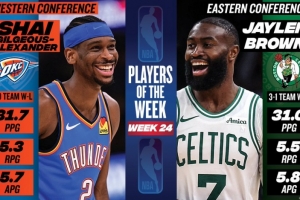 體育資訊4月7日訊 NBA官方公布了25-26賽季第24周的東西部周最佳球員,杰倫·布朗和亞歷山大當(dāng)選。