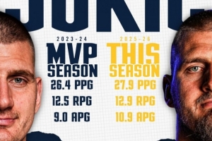 約基奇本賽季場(chǎng)均27.9分12.9籃板10.9助攻,上個(gè)MVP賽季(23-24賽季)場(chǎng)均26.4分12.5籃板9助攻。