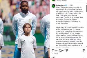 巴坎布社媒曬出自己在國家隊的照片,并寫道:“親愛的剛果兄弟姐妹們,我懷著無比的感激與自豪向大家宣布——我們的國家隊已成功晉級2026年世界杯!這個夢想,我與你們所有人共同分享。讓我們攜手在世界舞臺上發(fā)出剛果的聲音?!?/p>
