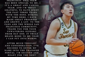 王俊杰寫道:“首先,我想感謝舊金山大學的教練和隊友們。這支球隊對我來說意義非凡,這是一個充滿關懷的偉大團隊。我非常感激過去三年能夠與多恩隊共度時光。在這里的日子里,我取得了很大的進步,也成長了許多。對于球迷和整個舊金山社區,從第一天起你們就給予了我堅定不移的支持,這對我來說意義重大,難以言表。