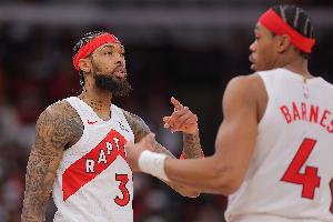 上半場比賽,猛龍前鋒英格拉姆和斯科蒂·巴恩斯都發揮不錯,進攻端內外線都狀態在線,其中英格拉姆9中6,三分2中1,罰球2中2拿到15分2籃板2助攻1搶斷;巴恩斯9中5,三分1中1,罰球3中3拿到14分4籃板1蓋帽。