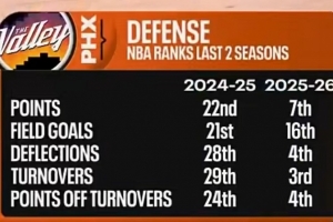 本賽季太陽(yáng)在失分、對(duì)手進(jìn)球數(shù)、場(chǎng)均干擾防守次數(shù)、造對(duì)手失誤、利用失誤得分等多項(xiàng)數(shù)據(jù)上,相比上賽季都有巨大提升,多項(xiàng)數(shù)據(jù)聯(lián)盟前列。