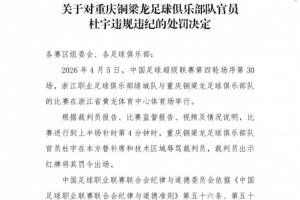 體育資訊04月08日訊 中足聯(lián)官網(wǎng)今日公布處罰決定,中超第4輪,浙江vs重慶銅梁龍,重慶銅梁龍助理教練杜宇辱罵裁判員,禁止進(jìn)入體育場6場,罰款6萬元。