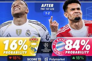 本場賽前,皇馬晉級歐冠四強的概率為34%,拜仁為66%;首回合比賽結束后,皇馬的晉級概率被下調至16%,拜仁則上升至84%。