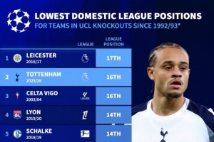 體育資訊3月10日訊 德國轉會市場統計了歐冠改制以來淘汰賽球隊的聯賽排名,并列出聯賽排名最低歐冠淘汰賽球隊榜單,本賽季熱刺排名僅高于2016-2017賽季的萊斯特城。