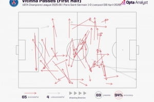 數(shù)據(jù)統(tǒng)計(jì)顯示,維蒂尼亞半場便完成了65次傳球,而利物浦全隊(duì)共計(jì)僅82次。