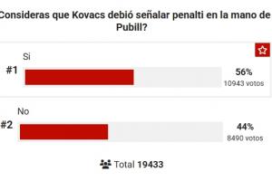 截至目前有19433人參與投票,56%的人認(rèn)為普比爾手球該被判點球,44%的人認(rèn)為不是點球。