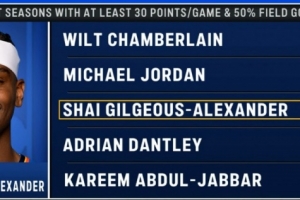 算上本賽季(場(chǎng)均31.3分,命中率55.4%),亞歷山大生涯第四次賽季以50%以上命中率場(chǎng)均砍下30+,歷史僅次于張伯倫的6次和喬丹的5次。