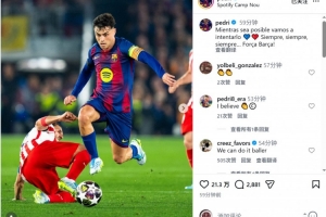 巴薩中場佩德里社媒曬出比賽照片,配文:“只要還有可能,我們就會努力嘗試。永遠、永遠、永遠,加油巴薩!”