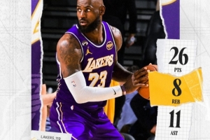 賽后,湖人官方發布詹姆斯本場26+8+11數據海報。