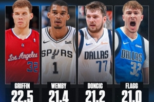 本賽季弗拉格場均21分,10-11賽季的格里芬場均22.5分,是00年至今場均得分最高的新秀,文班亞馬排在第二,東契奇排在第三。