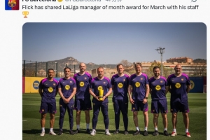 巴塞羅那在3月3場西甲保持全勝,主教練弗里克獲得了西甲聯(lián)賽頒發(fā)的三月最佳教練獎。弗里克一向重視教練團(tuán)隊的工作,他因此要求與自己最信任的團(tuán)隊成員一起領(lǐng)取這份榮譽(yù)。