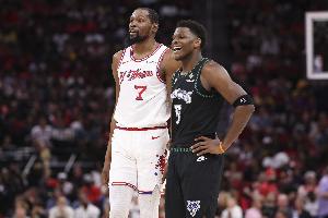 賽后,愛德華茲和杜蘭特?fù)肀е乱猓?dāng)被問及兩人對(duì)話內(nèi)容時(shí),愛德華茲笑著說道:“我在跟他要球衣,我已經(jīng)有一些了,但還想要一件。”