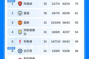 體育資訊04月11日訊 英超第32輪結束一場較量,阿森納主場1-2負于伯恩茅斯,多賽兩場對曼城的領先優(yōu)勢仍為9分,曼城將在明晚23點30客場對陣切爾西;完整英超積分榜如下。
