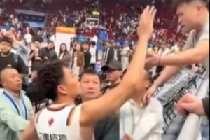 比賽結束后,場邊發生了一個小插曲,上海男籃球員李添榮想和場邊的球迷擊掌互動,但是遭到北京主場工作人員的攔截。